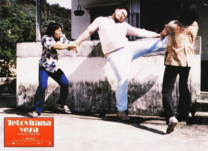 The director of the film, Lee Tso-Nam, would later direct Don in a modern Korean film called Wild Panther (1984). It not only has the same co-screenwriter (Chang Hsin-Yi), but one of the bad guys similarly has an eye patch. In The Tattoo Connection, the one-eyed bad guy was the same Hong Kong actor who pretended to be black in Enter the Fat Dragon. His name is Lee Hoi-San. There is a June 1996 video interview that Jim Kelly did where he had claimed that Bruce Lee wanted to do a film where Jim was his co-star. Cinematographer Tadashi Nishimoto had previously confirmed this in an interview for a Japanese magazine in the ‘70s. In the December 1994 issue of a British magazine called Impact, Bolo claimed that Bruce didn’t want to do any more movies in Hong Kong after Enter the Dragon. Not only that, but Bruce didn’t want to live in Hong Kong any more. As for the proposed movie with Shaw Brothers, House of Flying Daggers (2004) and Sword of Destiny (2016) are proof that you can pass off foreign locations as ancient China.