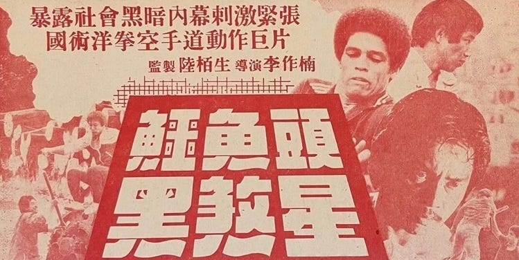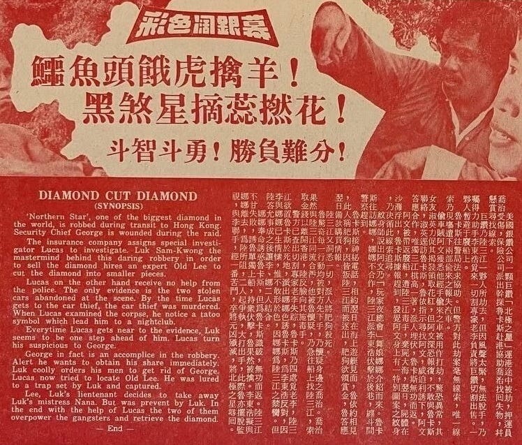 The Tattoo Connection is an example of a film with an abstract title and multiple titles. In Taiwan, it was called Giant Diamond Storm. When I was browsing a Taiwanese auction site called Ruten, I saw a 1978 brochure from the company behind the film. First Films was a Taiwanese company with a Hong Kong subsidiary. Their Hong Kong brochure was written in both English and Chinese. It advertised ten martial arts films. The Tattoo Connection was listed at the bottom with a simple Chinese title: Tattoo (it was the working title). When the film was released in Singapore, the English title was Diamond Cut Diamond. The Chinese title in Singapore and Hong Kong was Crocodile Head, Black Demon. In Cantonese slang, a crocodile is a criminal but a crocodile pool can also refer to the Hong Kong Stock Exchange. It’s not a coincidence that Bruce Lee fan Wong Jing made a 1989 film called Crocodile Hunter when you see the Easter eggs that he put into the movie.
