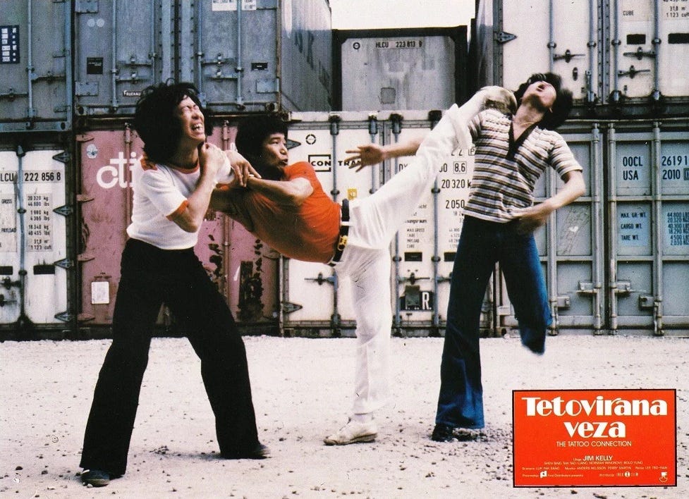 The Tattoo Connection sees poetic justice take shape in the form of poetry in motion when Jim Kelly gets to fight Bolo Yeung. Hong Kong was too slow to capitalize on Jim’s fame. In the April 20, 1978 issue of a black magazine called Jet, it was reported that he was going to Hong Kong to shoot a film. The Tattoo Connection was released in Hong Kong cinemas on July 27, so those Chinese film-makers really knew how to crank them out. What’s curious about this is that Sammo Hung’s parody of Bruce Lee’s The Way of the Dragon (1972) was not only released in the same month but it had finished its Hong Kong theatrical run on the day before The Tattoo Connection came out. As was the case with Black Panther, Sammo’s Enter the Fat Dragon has a Chinese martial artist made up to look black. By comparison, Bruce’s posthumously completed Game of Death had compensated for the absence of Kareem Abdul-Jabbar by filming a shorter black guy from a lower angle.